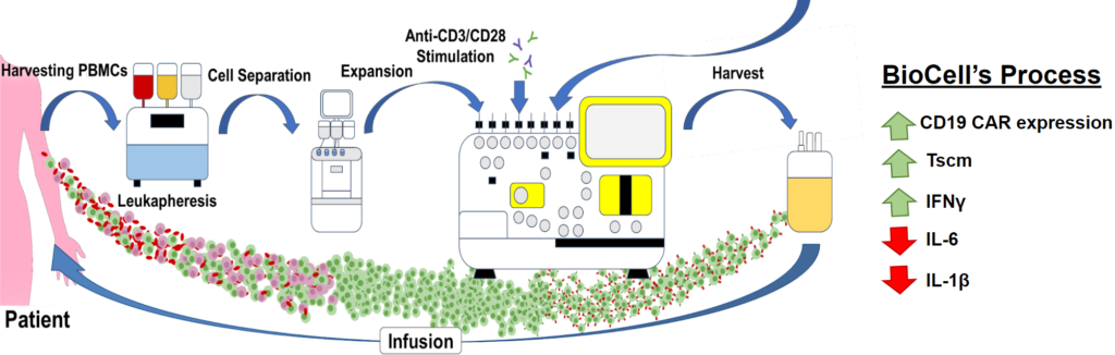- BioCell’s in-house CD19 CAR Lv is constructed using a humanized CD19 CAR T design. Furthermore, we have recently identified a novel soluble transduction enhancer that exhibits similar T-cell transduction efficiencies as mediated by RetroNectin which is cumbersome to use due to the requirement to pre-coat culture dishes or bags before cell seeding. More importantly, CAR-T products prepared in the presence of this soluble transduction enhancer exhibit markedly downregulates cytokines (e.g., IL-6) associated with cytokine release syndrome and immune effector cell-associated neurotoxicity syndrome, without affecting lymphoma cell kill, which indicate improved patient safety and treatment outcomes.